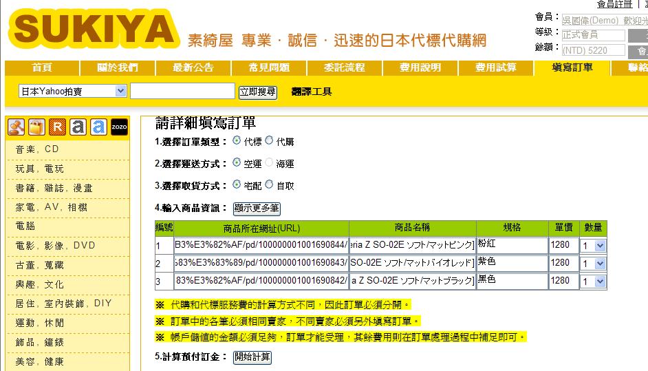 所以我把網址 產品名稱 規格 單價 及數量 填入表格