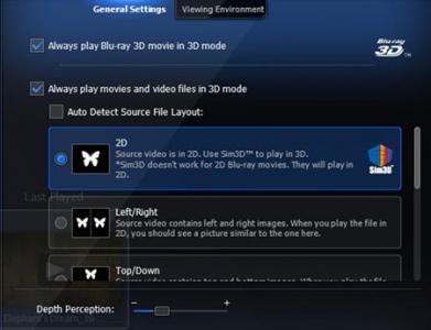 Sim3D - 使用我們最新獨創技術——Sim3D,可以輕鬆將2D照片幻燈片或DVD電影類比成3D的效果。他提供了真3D景深還原(基於場景及和運動變化演算)和景深調節功能。您甚至可以即時地在2D和3D之間進行切換。